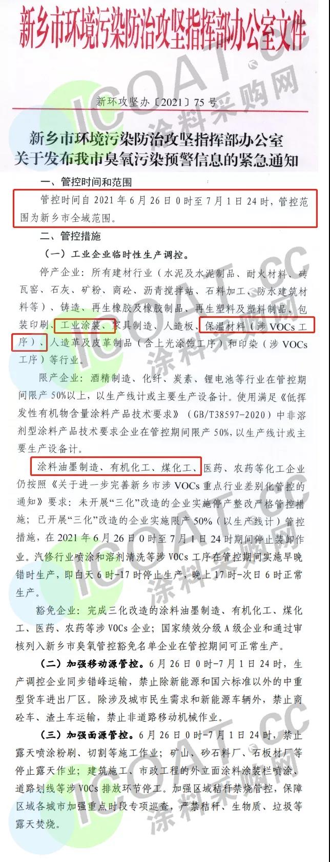 河南新鄉(xiāng):工業(yè)涂裝停產(chǎn),涂料制造限產(chǎn)
