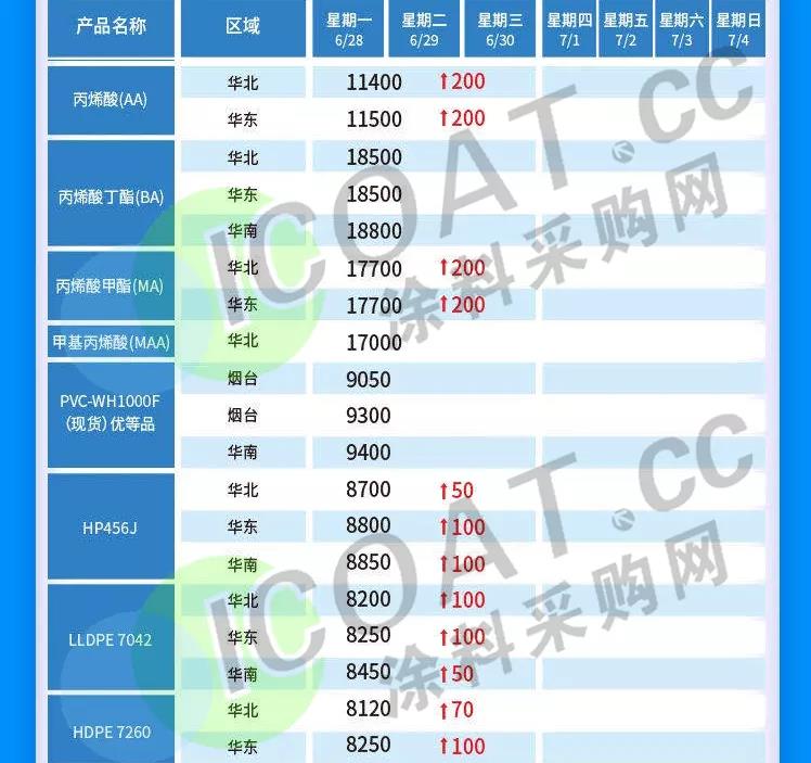 上海華誼丙烯酸最新報(bào)價(jià)(華東送到)在11000元/噸,較上一交易日相比上漲200元/噸,實(shí)際成交價(jià)以協(xié)商為主。