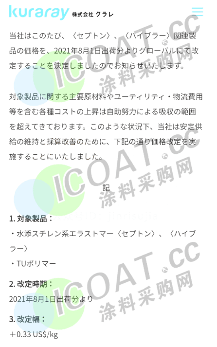 可樂麗:8月1日起,在全球范圍內上調公司所有等級的SEPTON™、HYBRAR™氫化苯乙烯類彈性體和TU聚合物的售價,漲幅為0.33美元/磅(約2138元/噸)。