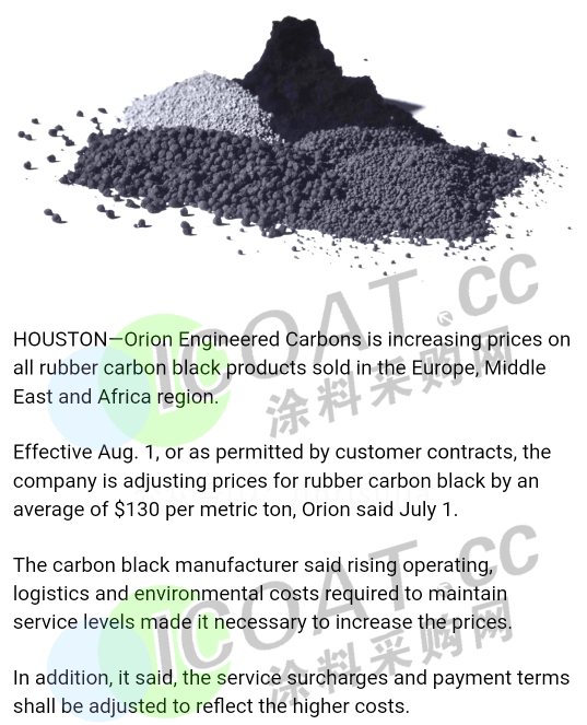 德國歐勵隆ORION(原贏創德固賽):從8月1日起公司橡膠炭黑的價格上調130美元/噸(約合人民幣841元/噸),此外,公告還宣布調整服務附加費和支付條件,以反映較高的成本。
