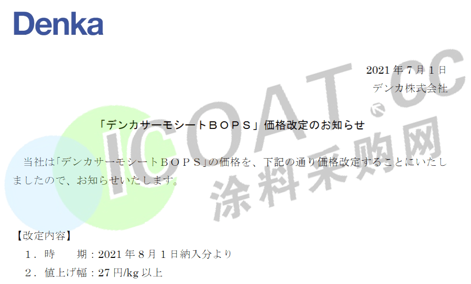 DENKA:因聚苯乙烯等原材料價格上漲導致成本增加,公司決定8月1日起對部分聚苯乙烯產品價格上調27日元/千克(約1572元/噸)。