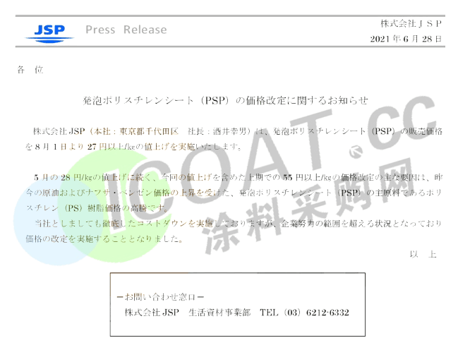 JSP株式會社:8月1日起,將發泡聚苯乙烯片材(PSP)的售價提高27日元/千克(約1576元/噸)以上。
