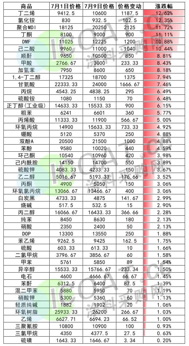 海外化工龍頭漲價的同時,國內的化工行業漲勢也沒有停歇的意思。盡管下半年才過去了不到半個月,但化工原材料價格持續飆升,你追我趕之下,幾十種化工品價格飛漲。其中聚合MDI上漲2125元/噸,甘氨酸、丁二醇、丁二烯、己二酸、DMF等原材料上漲超過1000元/噸。