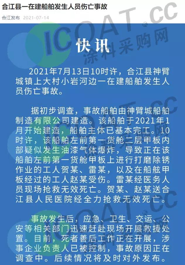 據初步調查,在建的金航866輪,由神臂城船舶制造有限公司于今年1月開始建造,船舶主體已基本完工。(當日)10時許,該船舶左前第一貨艙二層甲板內部疑似發生油漆氣體爆炸,導致正在該船舶左前第一貨艙甲板上進行打磨除銹作業的工人賀某、雷某,以及在船舷甲板經過的工人趙某受傷。雷某經醫務人員現場搶救無效死亡,賀某、趙某送合江縣人民醫院經全力搶救無效死亡。