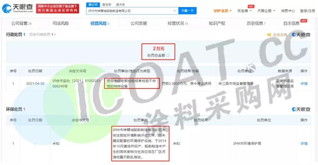 另據瀘州市生態環境局官網信息,2015年,瀘州市神臂城船舶制造有限公司曾因未依法報批環境影響評價文件,也未建設配套的環境保護設施,于2014年10月建成并投產,船舶制造中產生的固體廢物與生活垃圾在廠區河灘地露天散亂堆放被行政處罰;今年4月30日,該公司因使用未經定期檢驗或者檢驗不合格的特種設備被合江縣市場監督管理局罰款2萬元。