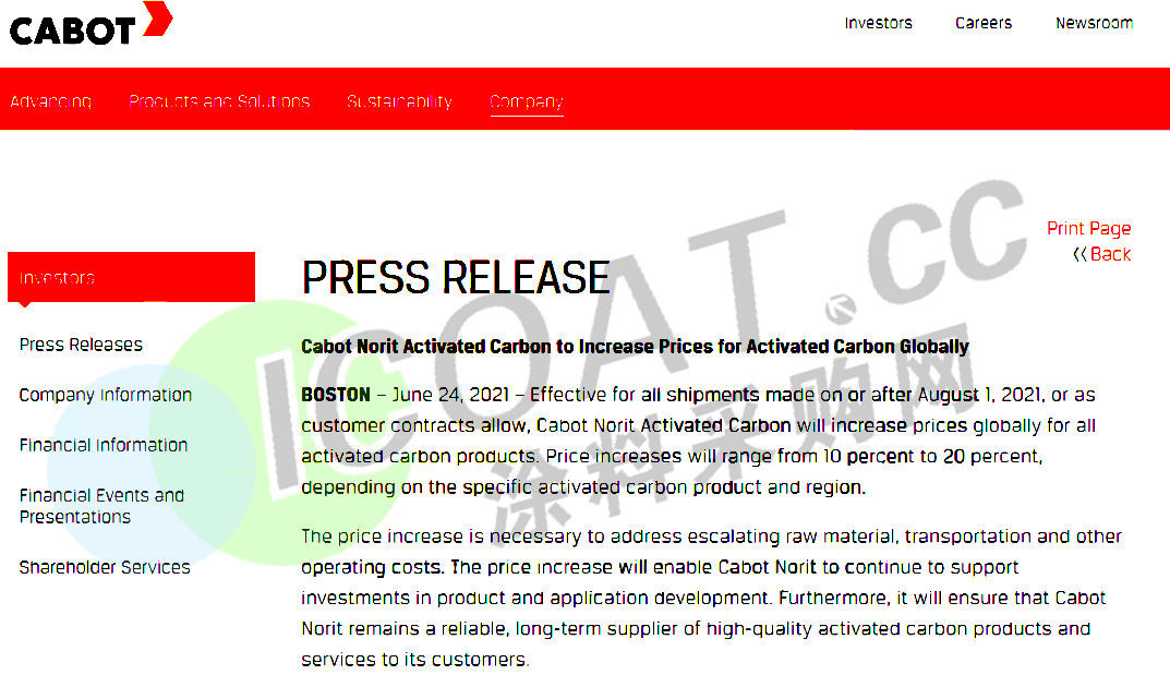 卡博特:8月1日起,卡博特諾芮特活性炭公司將在全球范圍內提高所有活性炭產品的價格,漲幅在10%-20%之間。