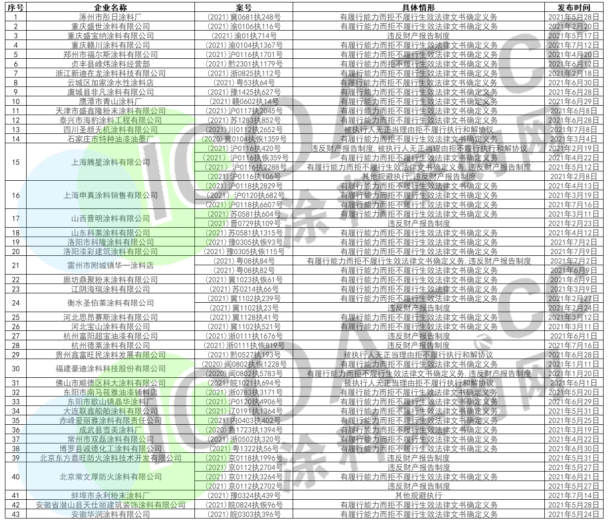 2021年至今被列入失信被執(zhí)行人部分涂料企業(yè)名單