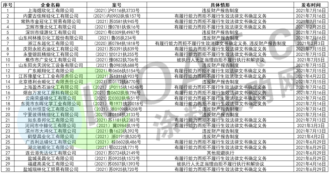 2021年至今被列入失信被執(zhí)行人部分化工企業(yè)名單