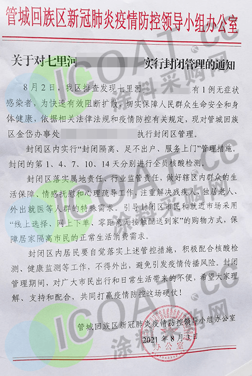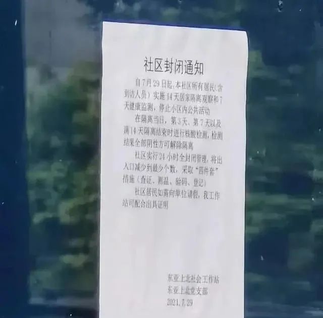 東亞上北社區工作站發布了封閉通知,自7月29日起,實施14天居家隔離觀察和7天健康監測,停止小區內公共活動,在隔離當日,第3天、第7天以及滿14天隔離結束時進行核算檢測,檢測結果全部陰性方可解除隔離。