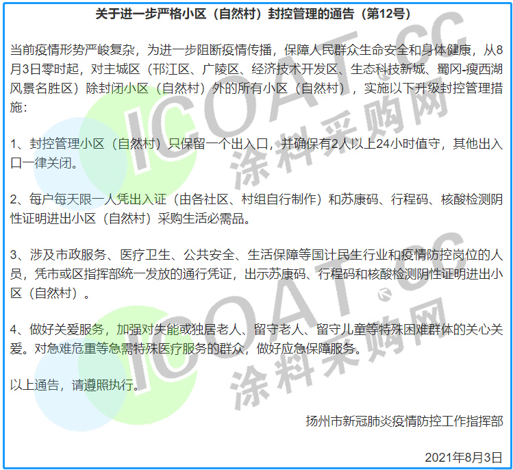 從8月3日零時起,對主城區(邗江區、廣陵區、經濟技術開發區、生態科技新城、蜀岡-瘦西湖風景名勝區)除封閉小區(自然村)外的所有小區(自然村),實施升級封控管理措施。封控管理小區(自然村)只保留一個出入口,并確保有2人以上24小時值守,其他出入口一律關閉。每戶每天限一人憑出入證(由各社區、村組自行制作)和蘇康碼、行程碼、核酸檢測陰性證明進出小區(自然村)采購生活必需品。