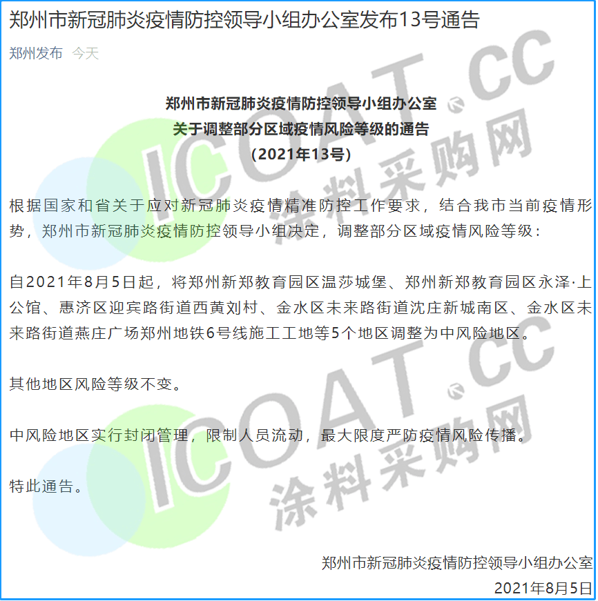 自2021年8月5日起,將鄭州新鄭教育園區溫莎城堡、鄭州新鄭教育園區永澤·上公館、惠濟區迎賓路街道西黃劉村、金水區未來路街道沈莊新城南區、金水區未來路街道燕莊廣場鄭州地鐵6號線施工工地等5個地區調整為中風險地區,其他地區風險等級不變。中風險地區實行封閉管理,限制人員流動,最大限度嚴防疫情風險傳播。