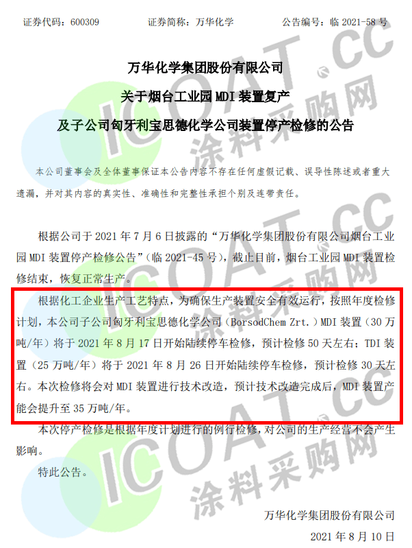 “化工一哥”萬華化學長達50天的裝置停車,也就意味著近2個月的時間里,MDI、TDI等產品供給量將驟減,這無疑在行業中激起了波瀾。且據涂料采購網了解,這種耗時較長的停車檢修在下半年的化工行業并不是個例。