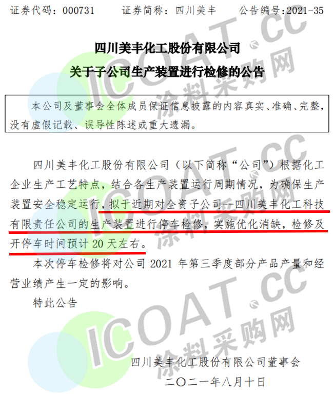 四川美豐:擬于近期對全資子公司四川美豐化工科技有限責任公司的生產裝置進行停車檢修,實施優化消缺,檢修及開停車時間預計20天左右。