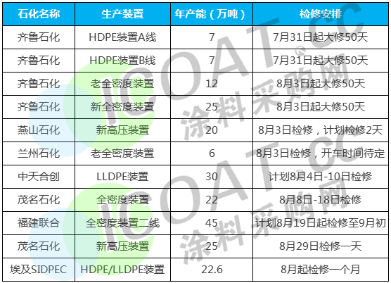 聚乙烯產品:齊魯石化、燕山石化、茂名石化等化工企業計劃于8月停車檢修,周期在50天左右。