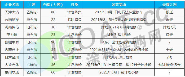 聚氯乙烯產品:田徑大沽、河南神馬、甘肅金川、齊魯石化等化工企業計劃于8-9月停車檢修,預計檢修最長45天。