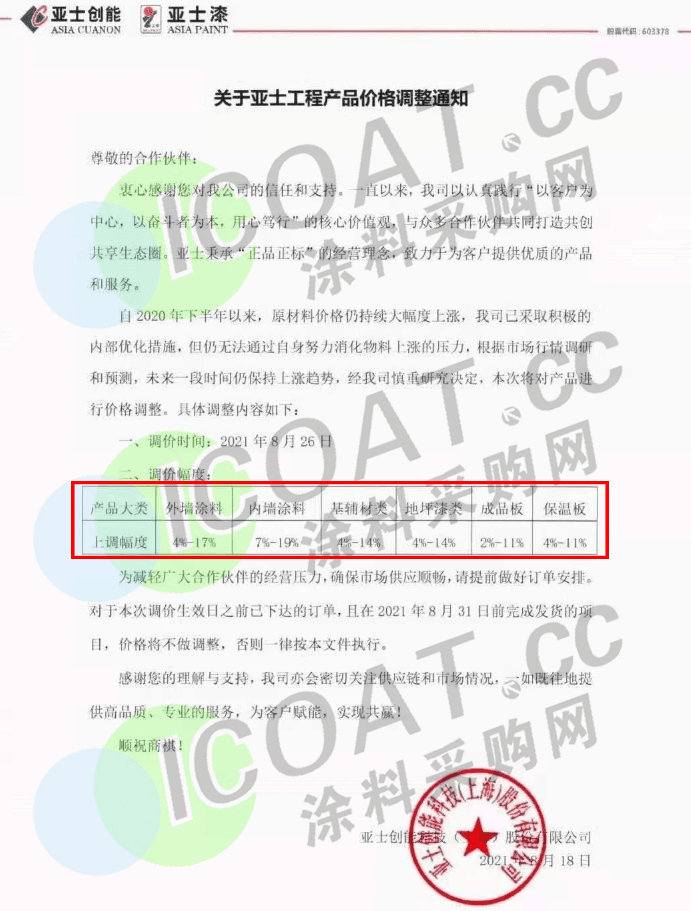 亞士創(chuàng)能:8月26日起,外墻涂料上調(diào)4%-17%,內(nèi)墻涂料上調(diào)7%-19%,基輔材類上調(diào)4%-14%,地坪漆類上調(diào)4%-14%,成品板上調(diào)2%-11%,保溫板上調(diào)4%-11%。