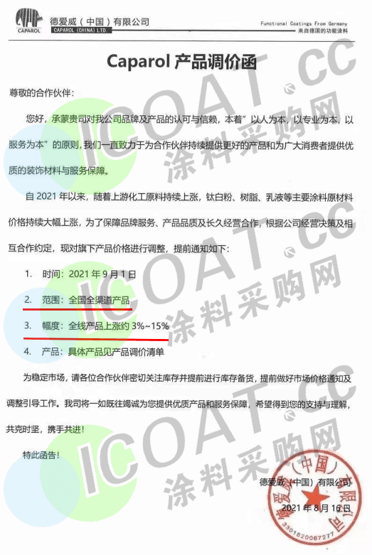 德愛威(中國)有限公司:9月1日起,全國全渠道全線產(chǎn)品上漲約3%-15%。