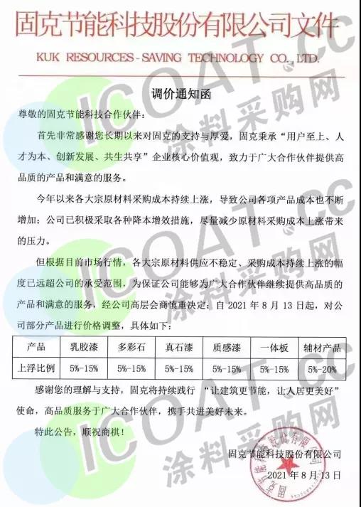 固克節(jié)能:8月13日起,乳膠漆上調(diào)5%-15%,多彩石上調(diào)5%-15%,真石漆上調(diào)5%-15%,質(zhì)感漆上調(diào)5%-15%,一體板上調(diào)5%-15%,輔材產(chǎn)品上調(diào)5%-20%。