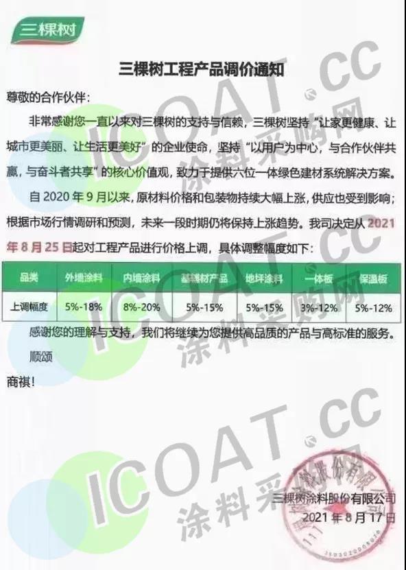 三棵樹涂料:25日起,外墻涂料上調(diào)5-18%,內(nèi)墻涂料上調(diào)8%-20%,基輔材產(chǎn)品上調(diào)5%-15%,地坪涂料上調(diào)5%-15%,一體板上調(diào)3%-12%,保溫板上調(diào)5%-12%。