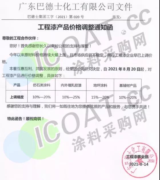 廣東巴德士化工:8月20日起,仿石類涂料上調(diào)10%-20%,內(nèi)外墻乳膠漆上調(diào)10%-25%,地坪涂料上調(diào)15%-20%,基輔材產(chǎn)品上調(diào)10%-20%。