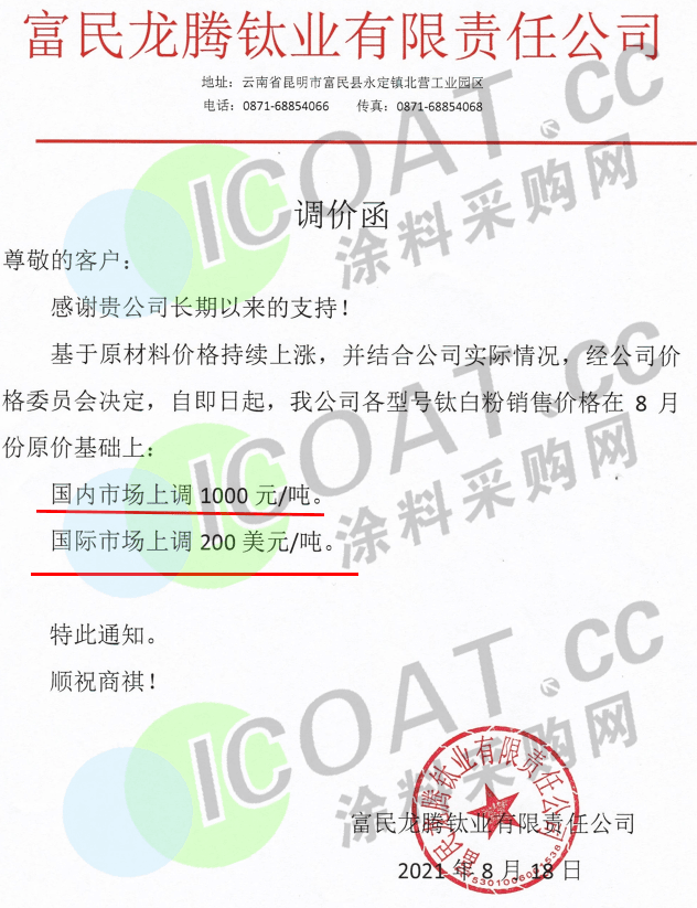富民龍騰鈦業(yè)有限責(zé)任公司:即日起鈦白粉國內(nèi)市場上調(diào)1000元/噸,國際市場上調(diào)200美元/噸。