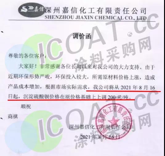深州嘉信化工:8月16日起,沉淀硫酸鋇價格在原價格基礎(chǔ)上上調(diào)200元/噸。