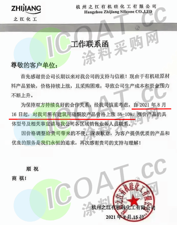 杭州之江有機硅化工:8月16日起,對所有建筑用硅酮膠產(chǎn)品上漲5%-10%。