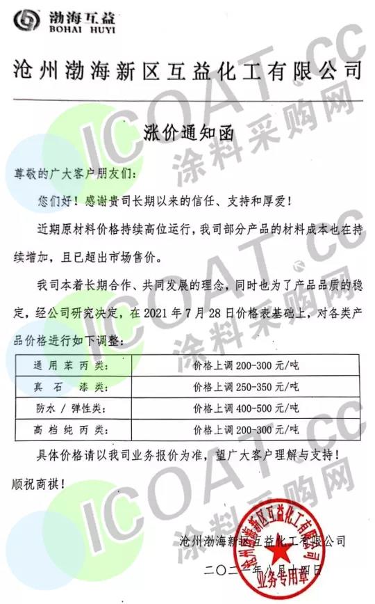 滄州渤海新區(qū)互益化工:在7月28日價格表基礎(chǔ)上,通用苯丙類上調(diào)200-300元/噸,真石漆類上調(diào)250-350元/噸,彈性/防水類上調(diào)400-500元/噸,高檔純丙類上調(diào)200-300元/噸。