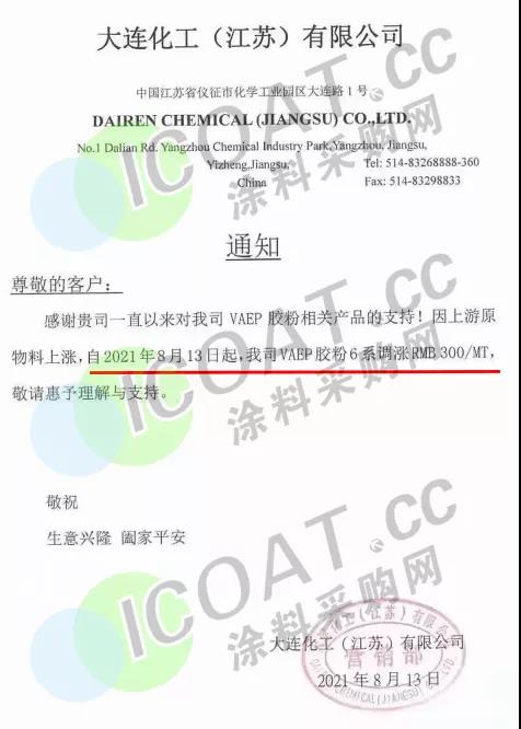 大連化工(江蘇):8月13日起,VAEP膠粉6系調(diào)漲300元/噸。