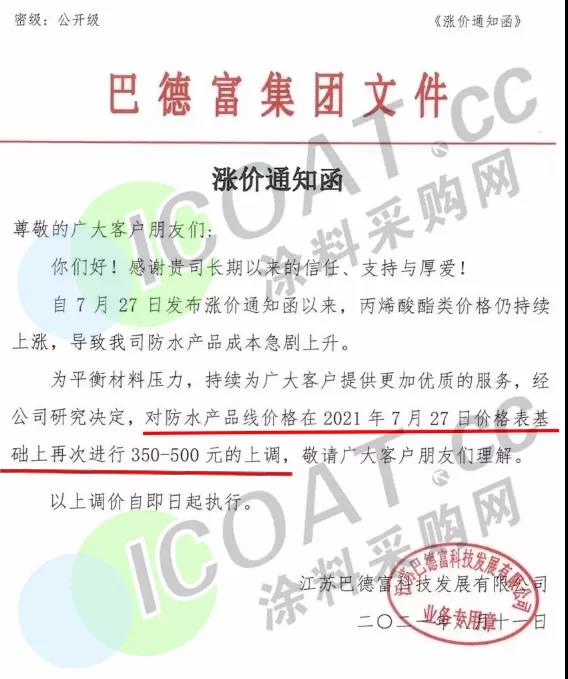 巴德富集團(tuán):對防水產(chǎn)品線價格在7月27日基礎(chǔ)上再次進(jìn)行350-500元/噸的上調(diào)。