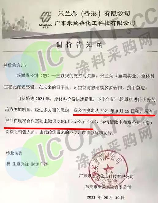 廣東米蘭朵化工:15日起,所有產(chǎn)品在現(xiàn)在合作基礎(chǔ)上微調(diào)0.5-1.5元/公斤。