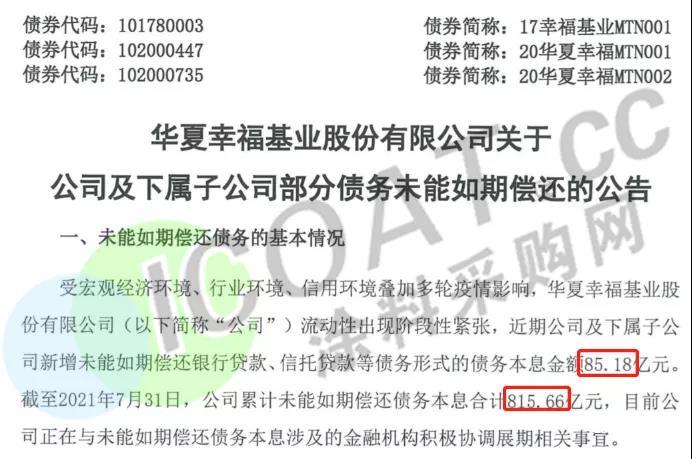 7月31日,華夏幸福公告顯示,受宏觀經濟環境、行業環境、信用環境疊加多輪疫情影響,華夏幸福基業股份有限公司流動性出現階段性緊張,近期公司及下屬子公司新增未能如期償還銀行貸款、信托貸款等債務形式的債務本息金85.18億元。