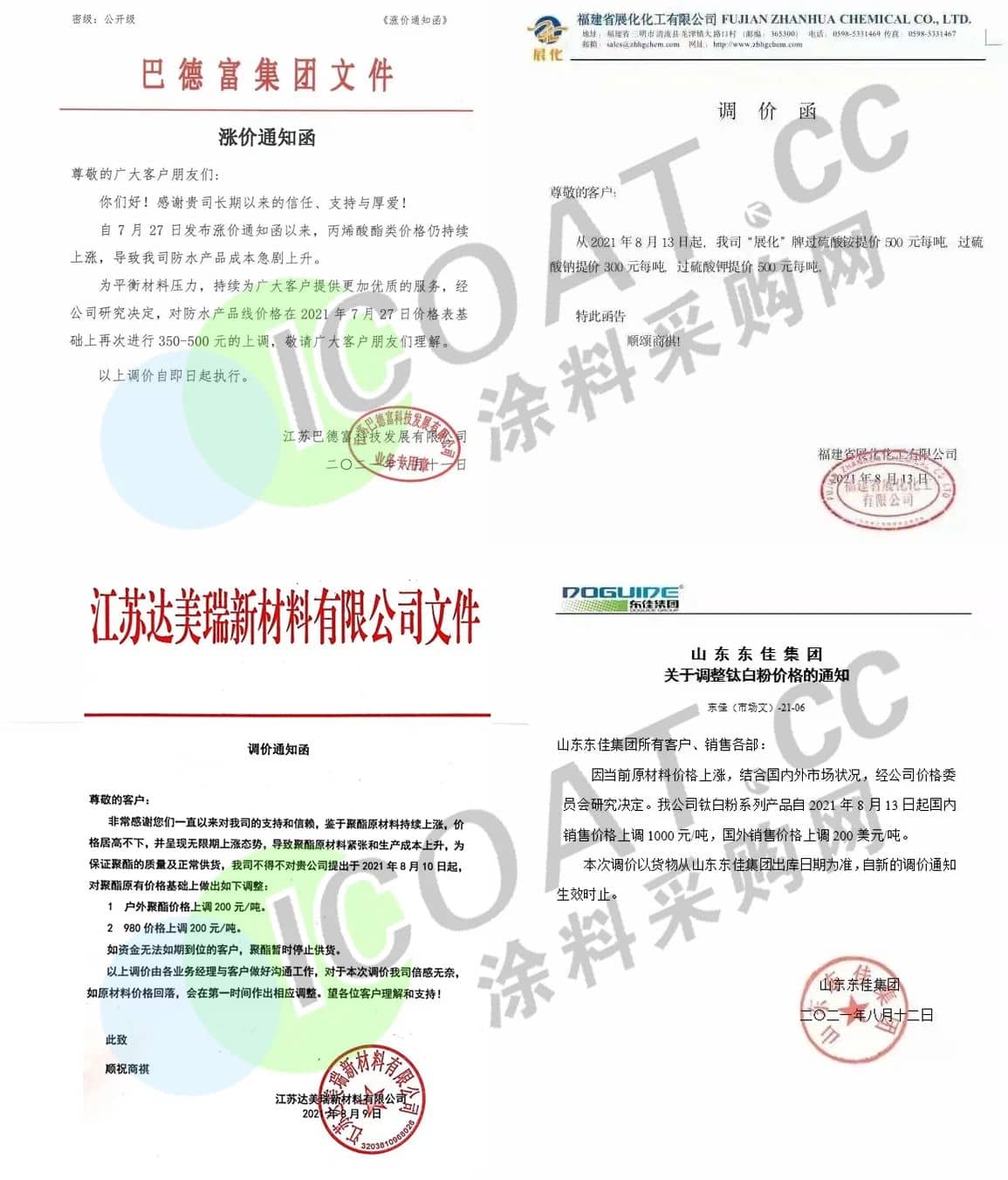 上游方面自不必說,近幾年原材料漲價一波幾折一波,今年更甚。鈦白粉累計(jì)漲幅超過50%,價格創(chuàng)4年新高,顏料產(chǎn)品動輒一單一議,單次調(diào)漲近1000元/噸;固化劑頻頻斷貨,價格翻倍,其原料異氰酸酯每季度增長兩位數(shù);環(huán)氧樹脂創(chuàng)下10余年新高,聚酯樹脂也在下半年呈現(xiàn)出直沖云霄之勢。溶劑價格漲超50%,乳液產(chǎn)品年內(nèi)上漲近3000元/噸,填料企業(yè)更是破天荒的屢屢發(fā)函調(diào)漲。如此算來,涂料企業(yè)成本方面每噸增加超過萬元。