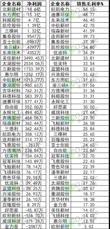 據涂料采購網不完全統計,在41家涂料行業上市公司(含新三板掛牌企業)中,37家企業上半年經營狀況為盈利,其中北新建材(18.6億元)、東方雨虹(15.3億元)、科順股份(4.7億元)、凱倫股份(1.39億元)、三棵樹(1.32億元)占據凈利潤排行榜前五名的位置,且在毛利率排行榜中,這幾個企業也占據了靠前的位置。不難看出,這幾家企業都有一個共同的特點,就是與防水行業相關。