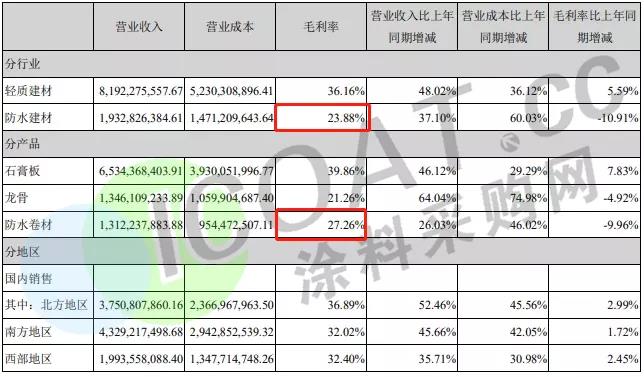 在毛利率方面,北新建材毛利率為33.81%,防水建材行業毛利率為23.88%,防水卷材產品毛利率為27.26%。