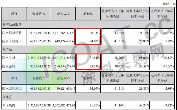在毛利率方面,東方雨虹為31.61%。防水材料銷售行業毛利率為33.72%,防水工程施工行業毛利率為28.57%;防水卷材產品毛利率為33.06%,防水涂料產品毛利率為34.73%。