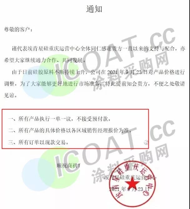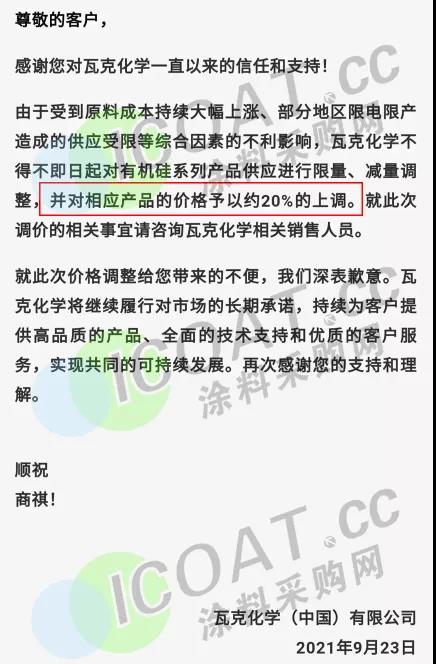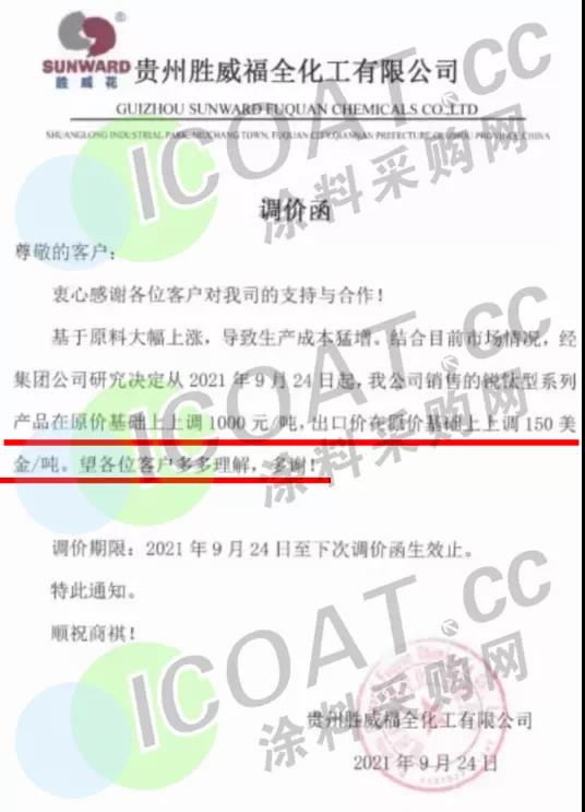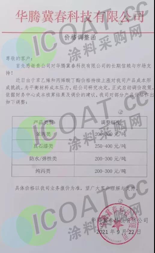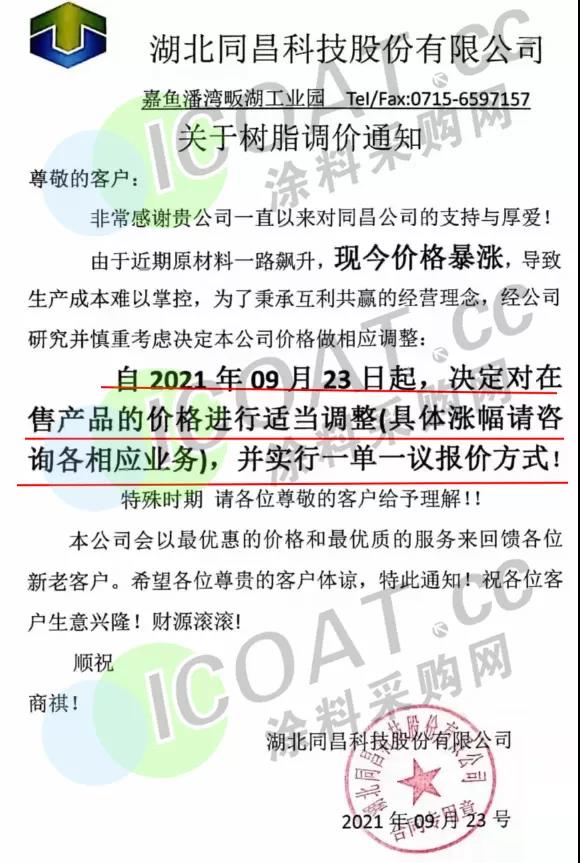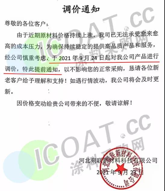 深圳市彩田化工有限公司:經(jīng)研究討論決定,油性產(chǎn)品價(jià)格將在原有價(jià)格基礎(chǔ)上調(diào)10%,新客戶自2021年9月23日起實(shí)行,老客戶自2021年09月30日起實(shí)行。