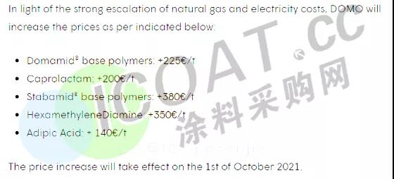 奇鈦(上海)化學(xué)科技有限公司:受“雙減雙控”的政策影響,全球基礎(chǔ)原料價(jià)格持續(xù)上漲,導(dǎo)致各項(xiàng)產(chǎn)品成本都明顯提高。為了保證產(chǎn)品質(zhì)量和穩(wěn)定供應(yīng),自9月22日起,產(chǎn)品價(jià)格將進(jìn)行適當(dāng)調(diào)整。