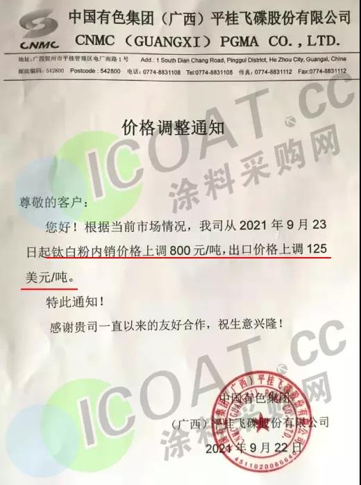 廣西順風(fēng)鈦業(yè)有限公司:9月22日起,各型號(hào)鈦白粉銷售價(jià)格在原價(jià)基礎(chǔ)上上調(diào)800元/噸。