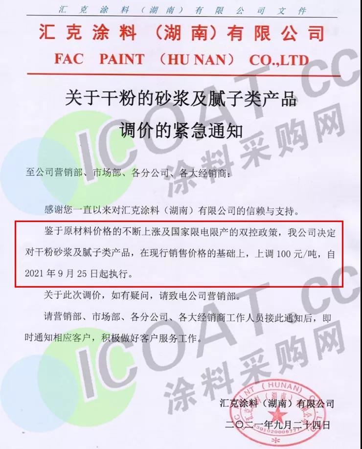 匯克涂料(湖南)有限公司:25日起,干粉砂漿及膩?zhàn)宇惍a(chǎn)品,在現(xiàn)行銷售價(jià)格的基礎(chǔ)上上調(diào)100元/噸。