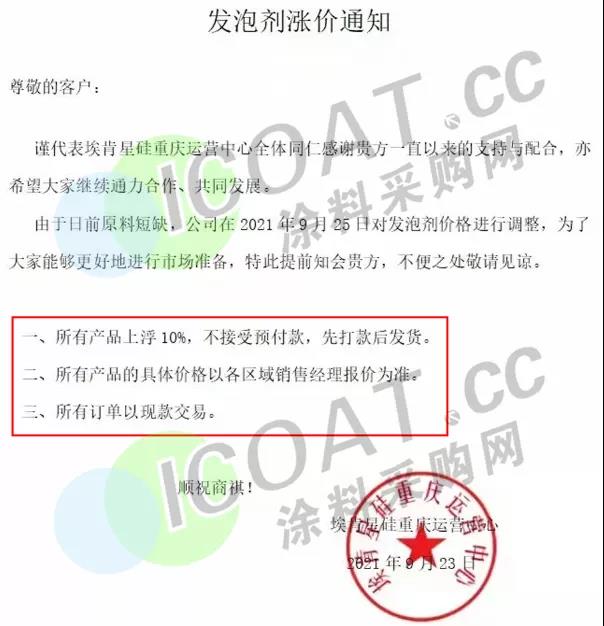 埃肯星硅重慶運(yùn)營(yíng)中心:23日對(duì)所有產(chǎn)品價(jià)格進(jìn)行調(diào)整,所有產(chǎn)品執(zhí)行一單一議,不接受預(yù)付款;所有產(chǎn)品的具體價(jià)格以各區(qū)域銷售經(jīng)理報(bào)價(jià)為準(zhǔn);所有訂單以現(xiàn)款交易。25日對(duì)發(fā)泡劑價(jià)格進(jìn)行調(diào)整,所有產(chǎn)品上浮10%,不接受預(yù)付款,先打款后發(fā)貨;所有產(chǎn)品的具體價(jià)格以各區(qū)域銷售經(jīng)理報(bào)價(jià)為準(zhǔn);所有訂單以現(xiàn)款交易。