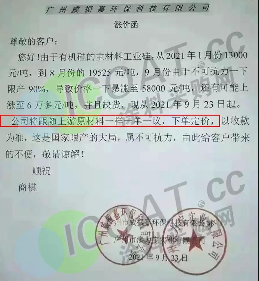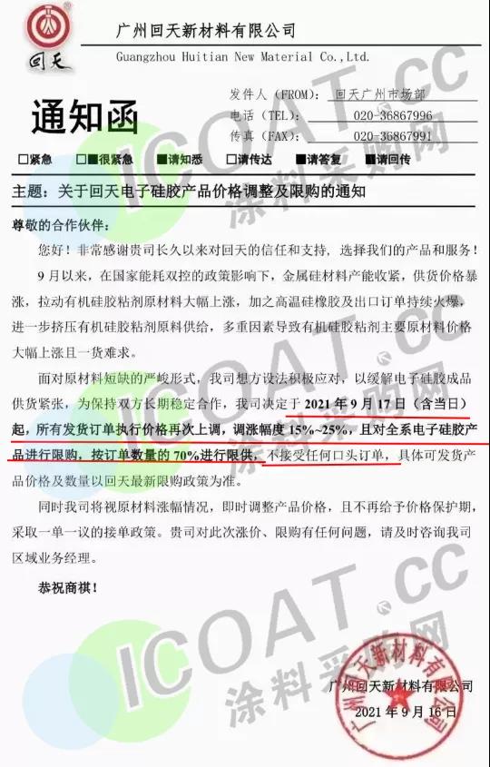 而在前一日,湖北回天新材料發(fā)函表示,面對(duì)原材料短缺的嚴(yán)峻態(tài)勢(shì),成品供貨緊張,將于15日起,對(duì)工業(yè)全系硅膠產(chǎn)品進(jìn)行限購(gòu),在此期間經(jīng)銷商進(jìn)貨量將按訂單70%進(jìn)行限購(gòu),且不接受口頭訂單。