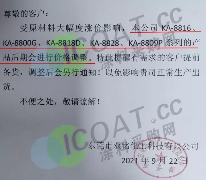 東莞市雙銘化工科技有限公司:受原材料大幅度漲價(jià)影響,KA-8816、KA-8800G、KA-8818D、KA-8828、KA-8809P系列的產(chǎn)品后期會(huì)進(jìn)行價(jià)格調(diào)整。