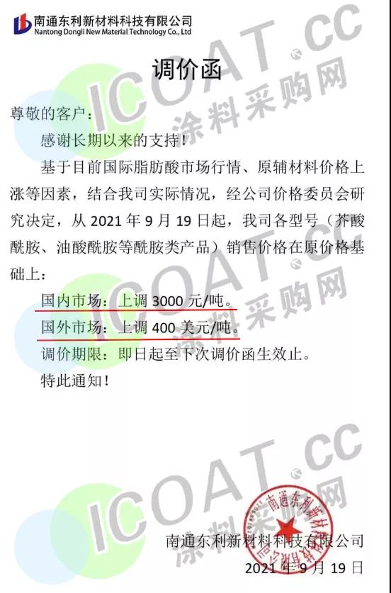 南通東利新材料科技有限公司:19日起,各型號(hào)(芥酸酰胺、油酸酰胺等酰胺類產(chǎn)品)銷售價(jià)格在原價(jià)格基礎(chǔ)上: