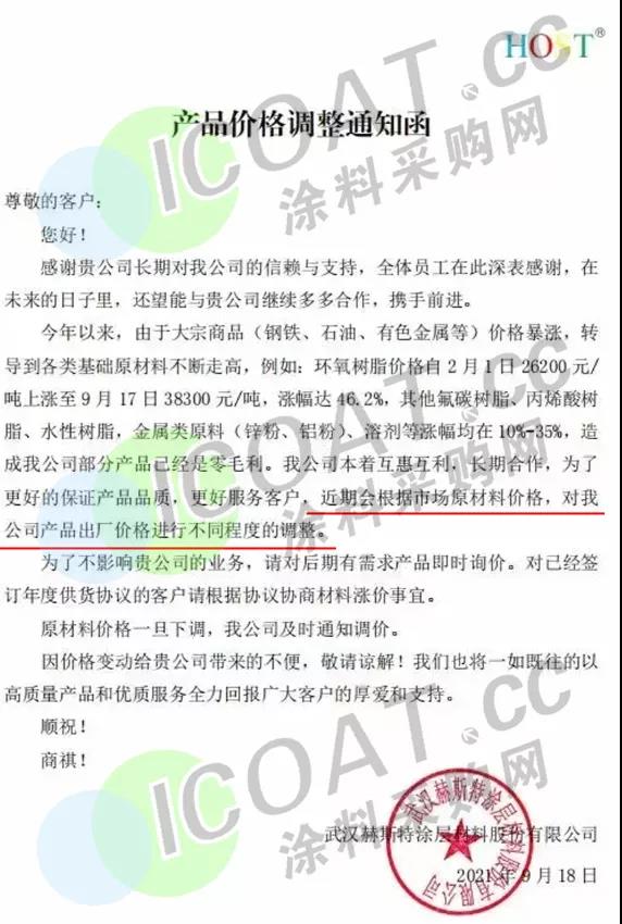 武漢赫斯特涂層材料股份有限公司:由于大宗商品價(jià)格暴漲,造成部分產(chǎn)品已經(jīng)是零毛利,企業(yè)近期會(huì)根據(jù)市場(chǎng)原材料價(jià)格,對(duì)產(chǎn)品出廠價(jià)格進(jìn)行不同程度的調(diào)整。