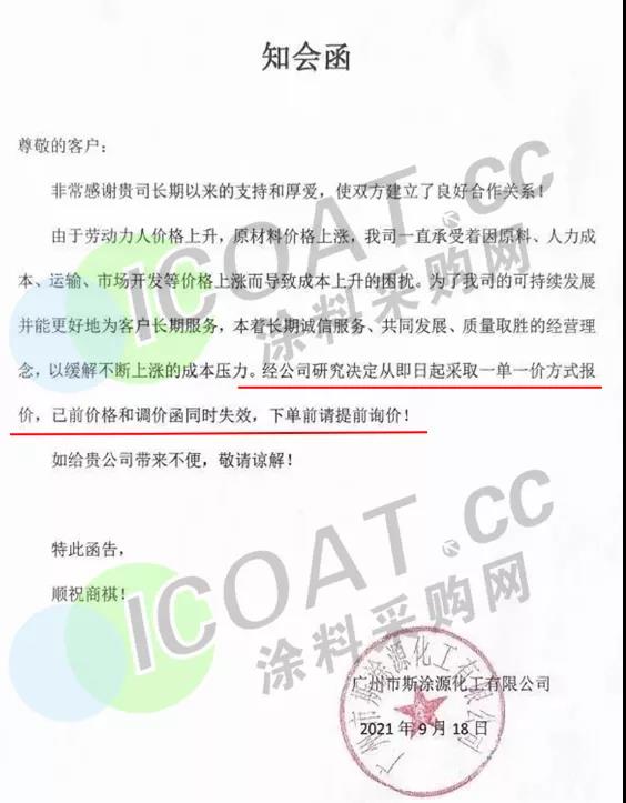 廣州市斯涂源化工有限公司:即日(18日)起采取一單一價(jià)方式報(bào)價(jià),以前的價(jià)格和調(diào)價(jià)函同時(shí)失效。