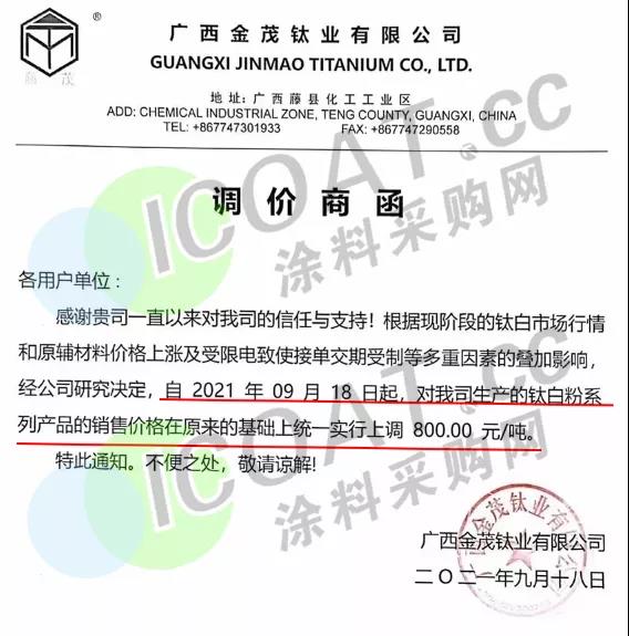 廣西金茂鈦業(yè)有限公司:18日起,鈦白粉系列產(chǎn)品的銷售價(jià)格在原來(lái)的基礎(chǔ)上統(tǒng)一實(shí)行上調(diào)800元/噸。