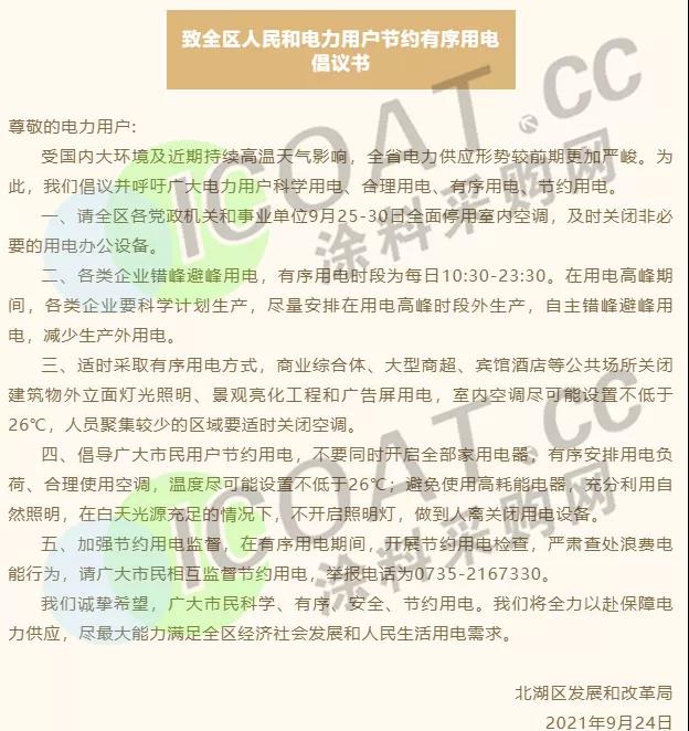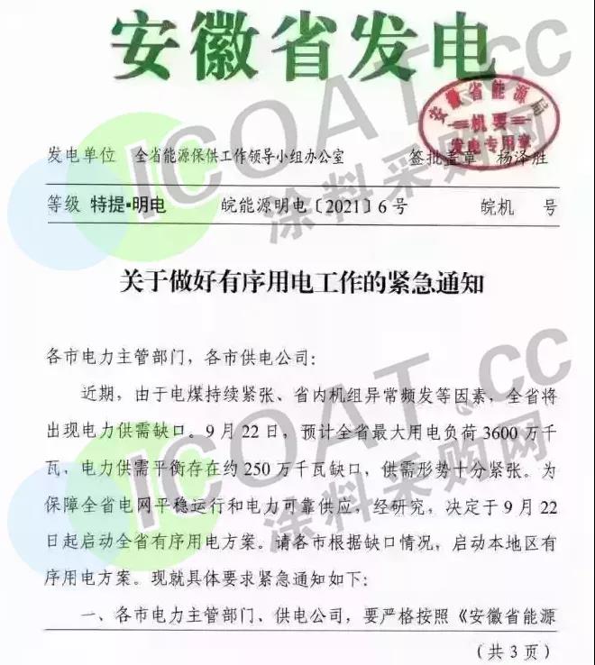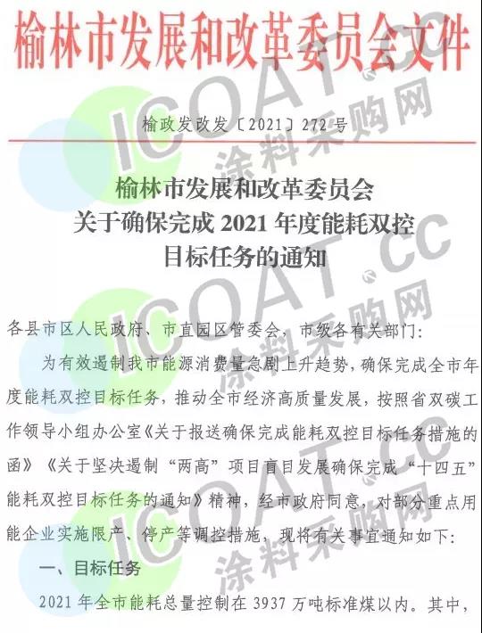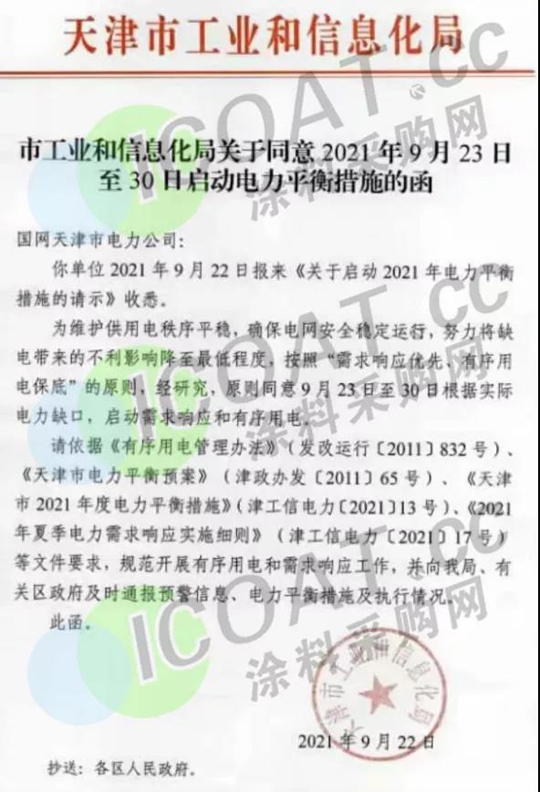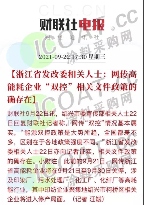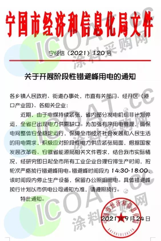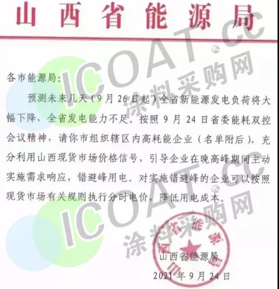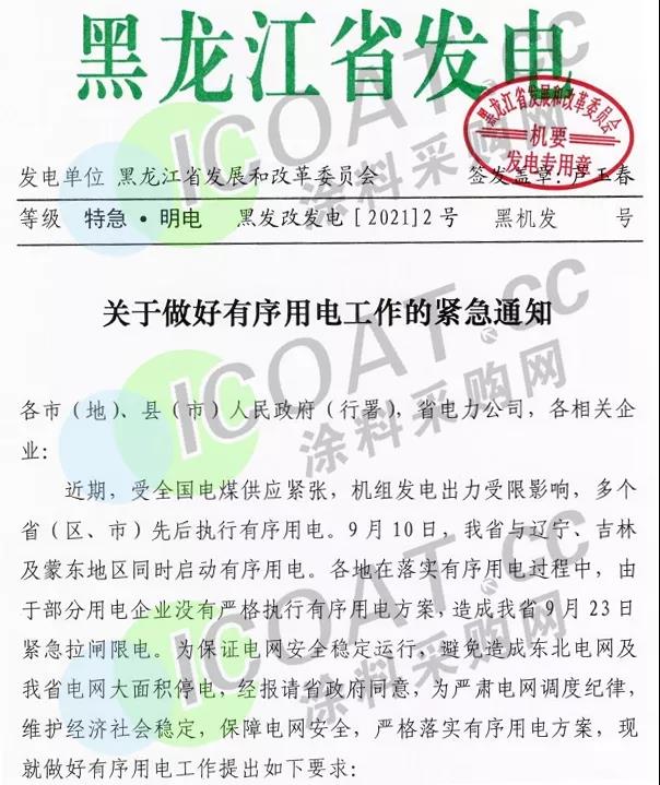 據涂料采購網了解,近期國內多地“能耗雙控”加碼,黑龍江、安徽、浙江、江蘇等多地采取限電模式,要求按規定進行開工和錯峰生產,保障有序用電。
