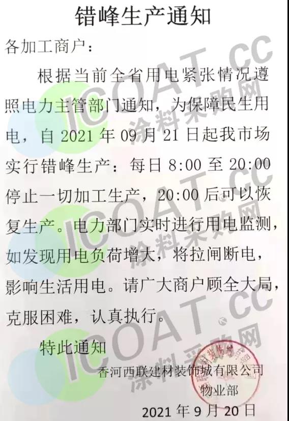 某裝飾城有限公司收到通知,自21日起市場實施錯峰生產,每日8:00至20:00停止一切加工生產,20:00后可以恢復生產。電力部門實時進行用電檢測,如發現用電負荷增大,將拉閘斷電,影響生活用電。