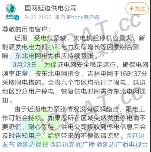 由于近期省內電煤緊張,導致吉林省各發電廠發電供應不足,電網運行受到影響。根據吉林省能源局(吉能電力【2021】275號)文件統一部署,為保證電網安全運行,上級電力調度部門隨時可能下達停電、限電指令。由于情況緊急不能提前通知。